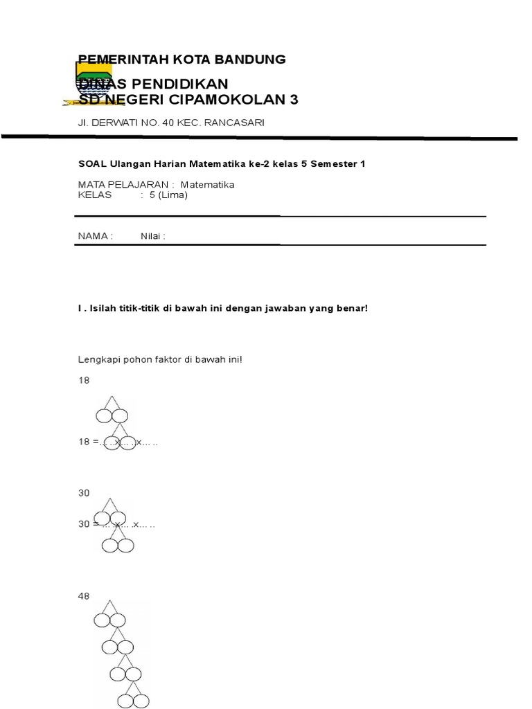 Soal Ulangan Harian Matematika Kelas 5 Ss Semester 1