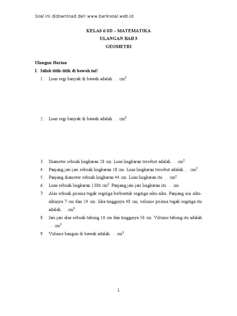 Soal Matematika Kelas 6 Sd Semester I Ulangan Bab 3 Geometri