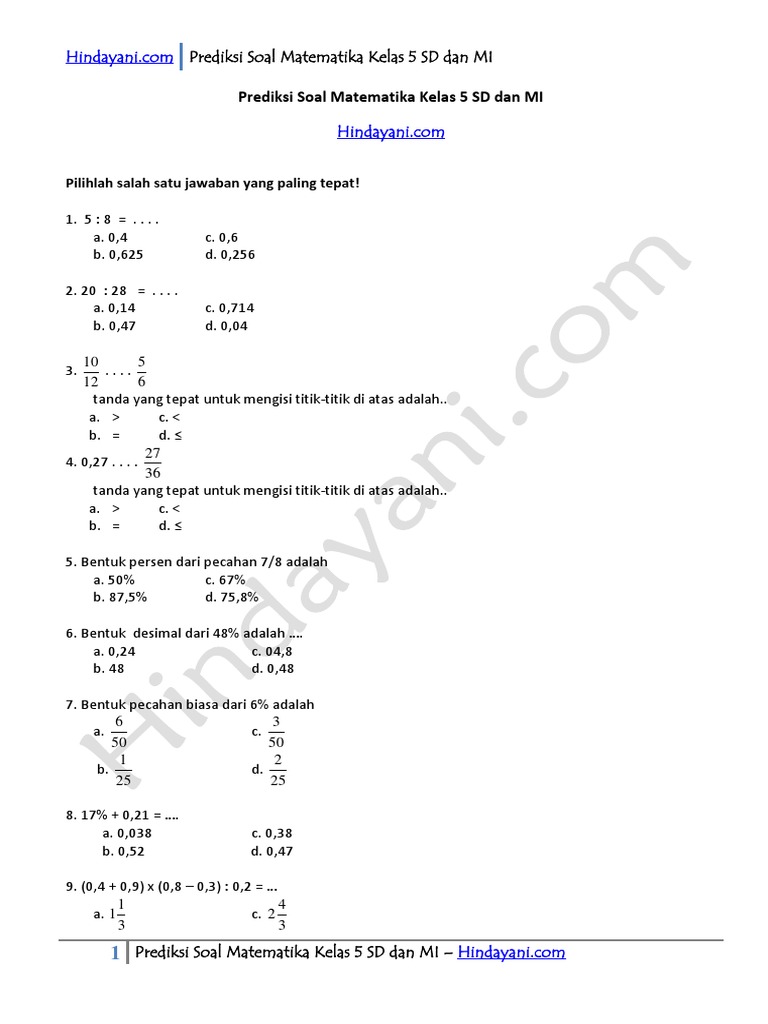 Prediksi Soal Matematika Kelas 5 Sd Dan Mi Hindayani Com