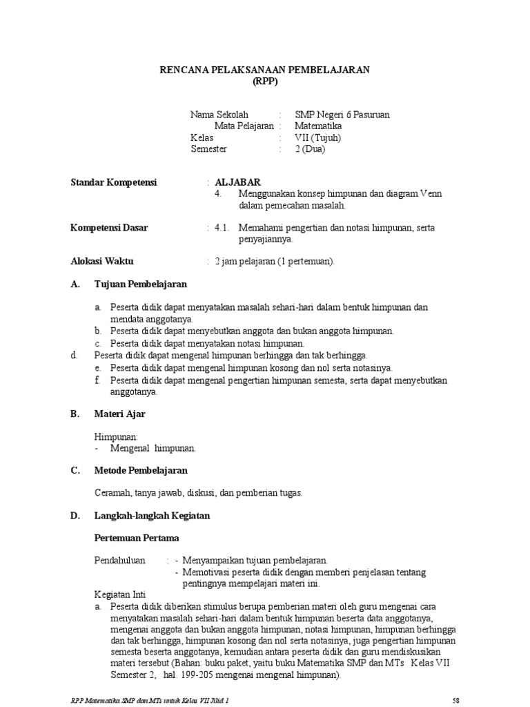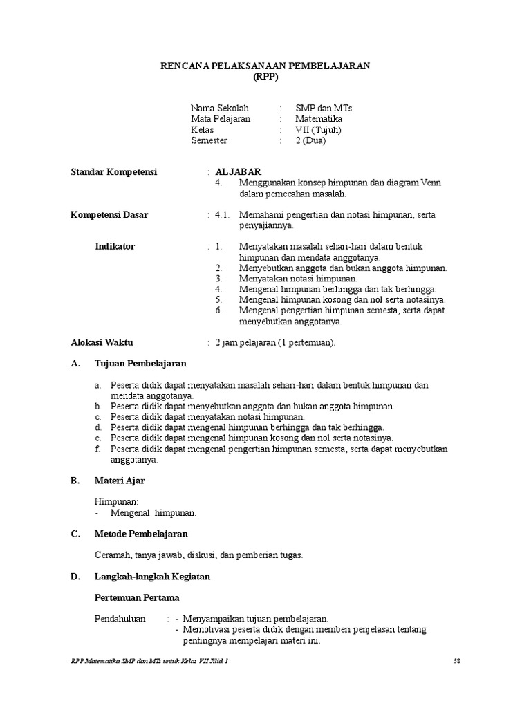 Rpp Matematika Kelas Vii 4 Doc