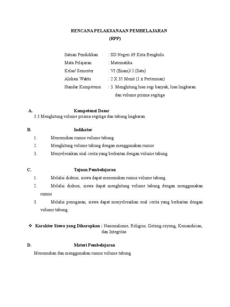 1 Rpp Mm Kelas 6 Prisma Dan Tabung