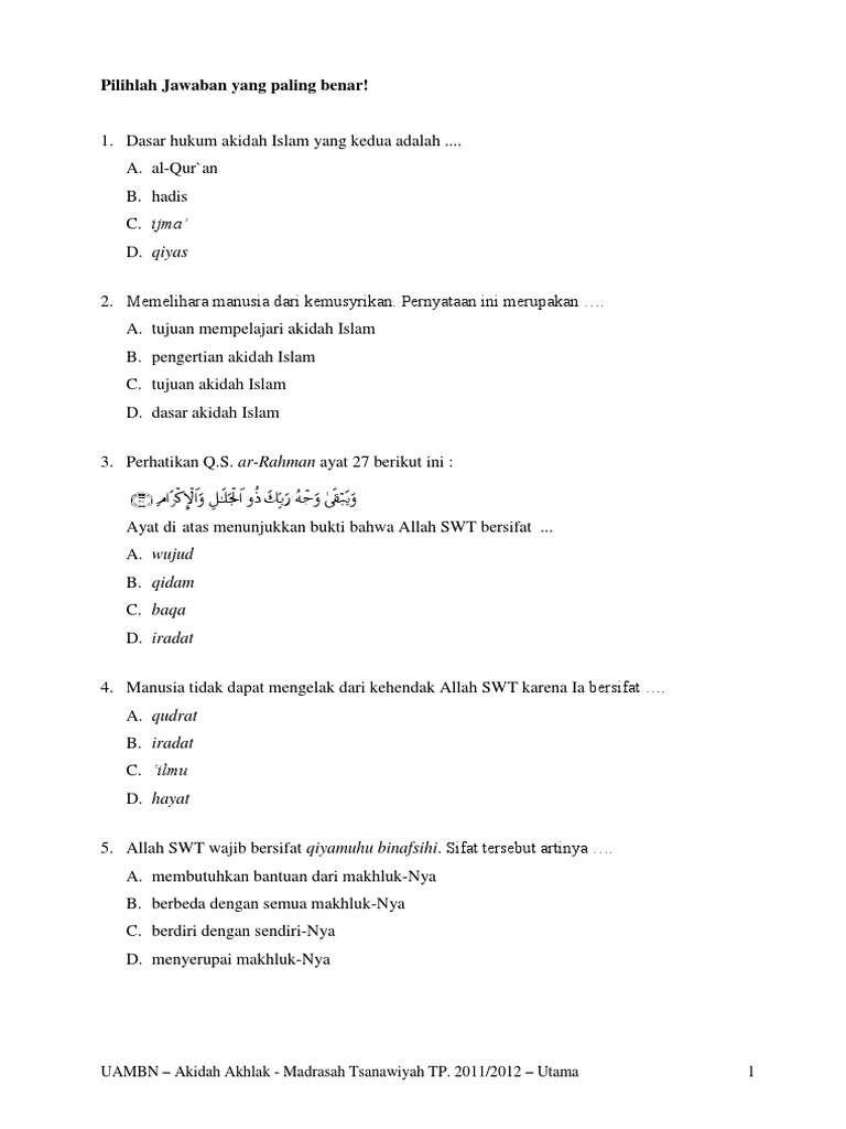 2 Soal Uambn Akidah Akhlak Mts Utama