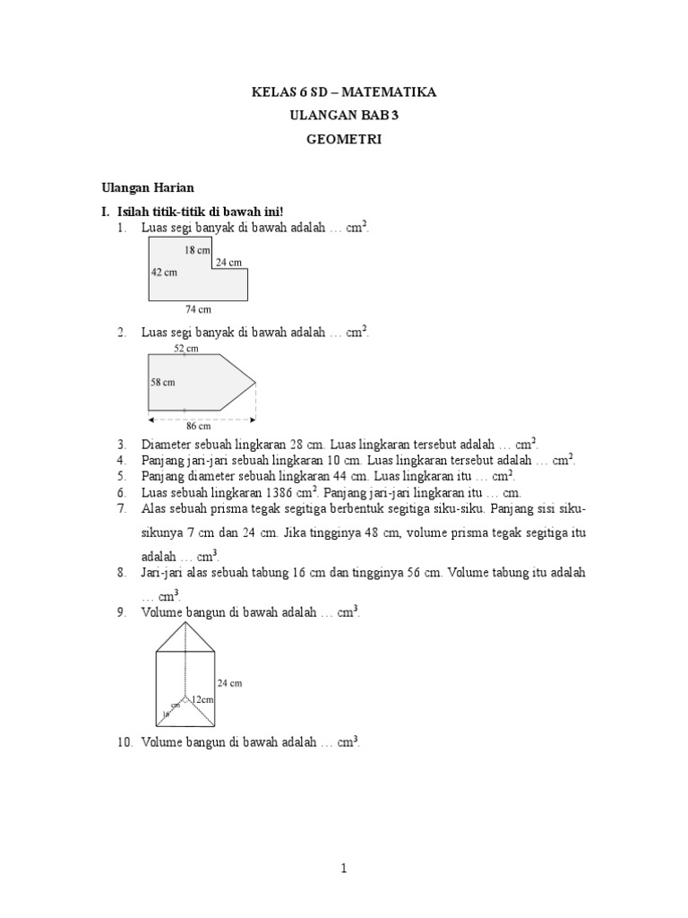 Soal Matematika Kelas 6 Sd Bab 3 Luas Dan Volume Dan Kunci