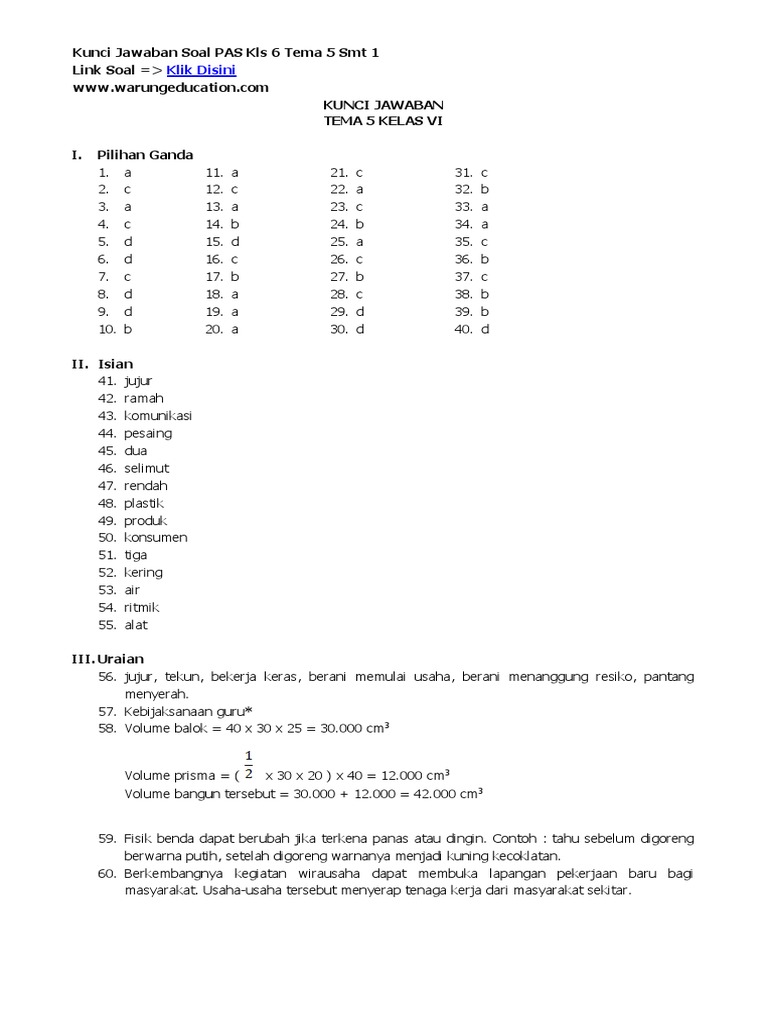 Kunci Jawaban Soal Pas Uas Kelas 6 Tema 5 Semester 1
