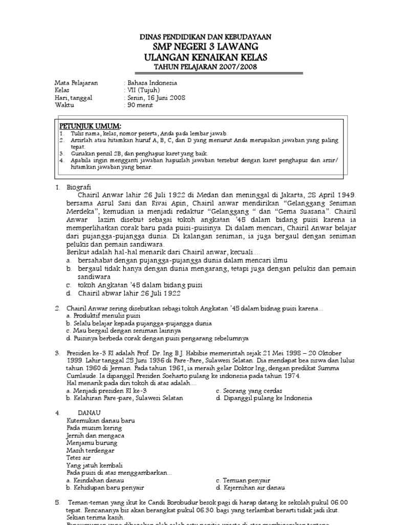 Soal Bahasa Indonesia Smp Kelas 7 Dan Jawabannya Ukk 2016