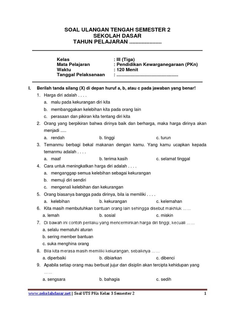 Soal Latihan Uts Pkn Kelas 3 Sd Mi Semester 2